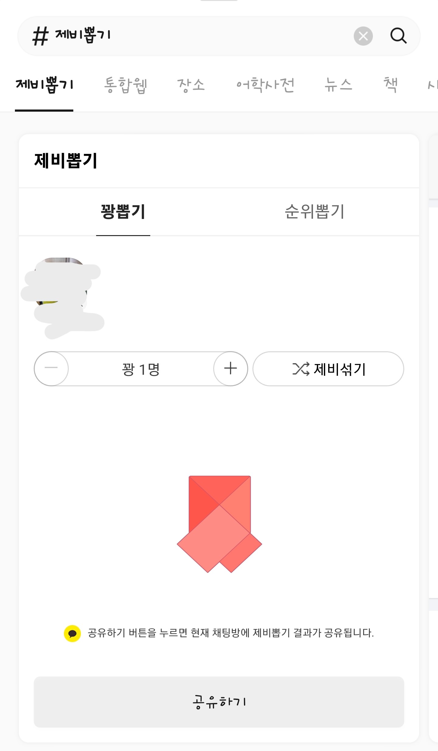 3. '꽝'의 갯수를 설정한 다음 '공유하기'를 선택해서 채팅방에 공유합니다.