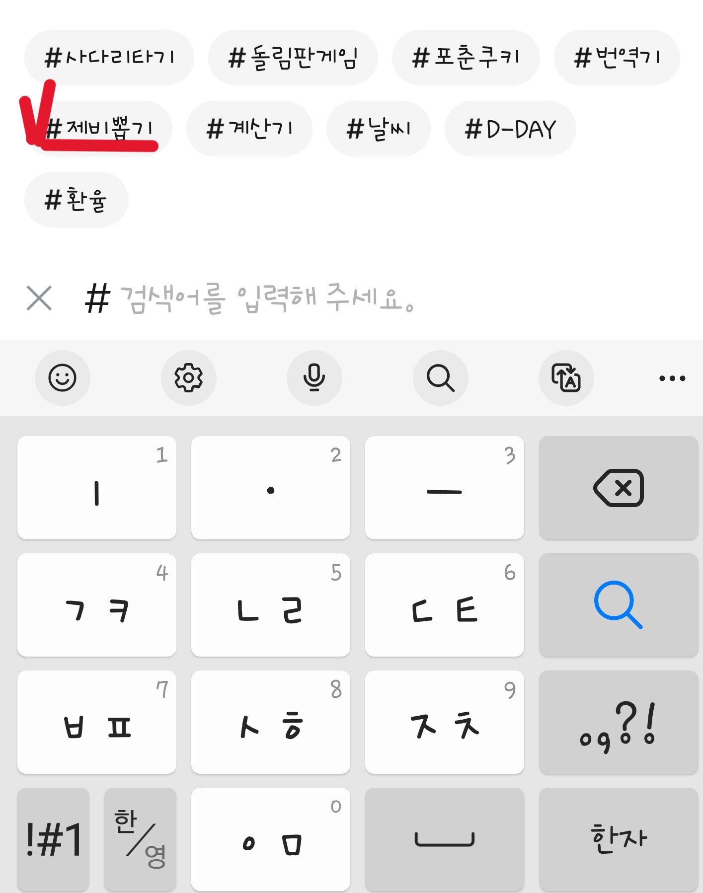 2. 입력창 하단에서 #를 클릭하여 #제비 뽑기를 선택합니다. 검색어 입력란에 '제비 뽑기'를 입력하여 검색을 해도 됩니다.