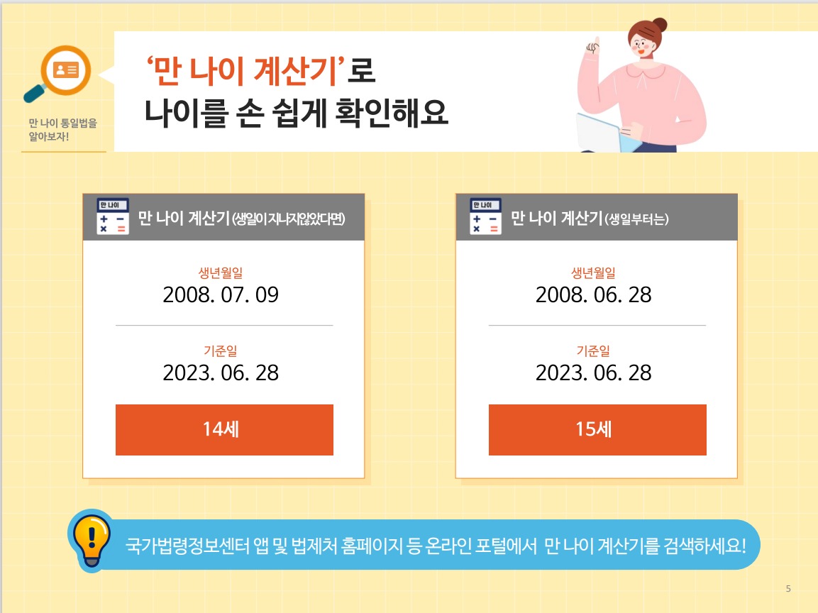 - 2023년 6월28일 이후부터는 법령, 계약서, 문서 등에 사용하는 나이가 한국식 나이, 만 나이, 연 나이 중 어느 것에 해당하는지를 두고 일어났던 법적 다툼이나 민원이 사라질 것으로 기대됩니다.