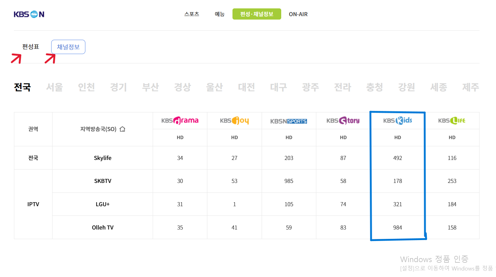 화살표를 보시면 편성표와 채널정보를 클릭해서 확인 할 수 있고, 지역별 KBSKids 번호가 상세히 안내되어 있습니다.