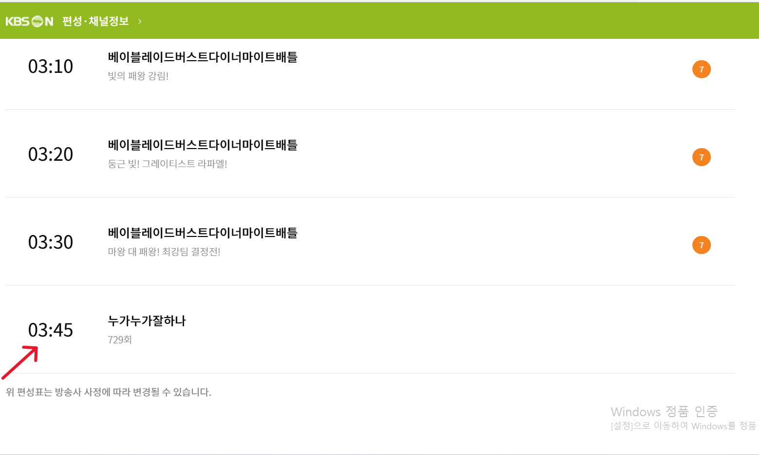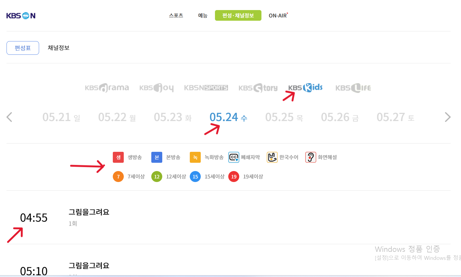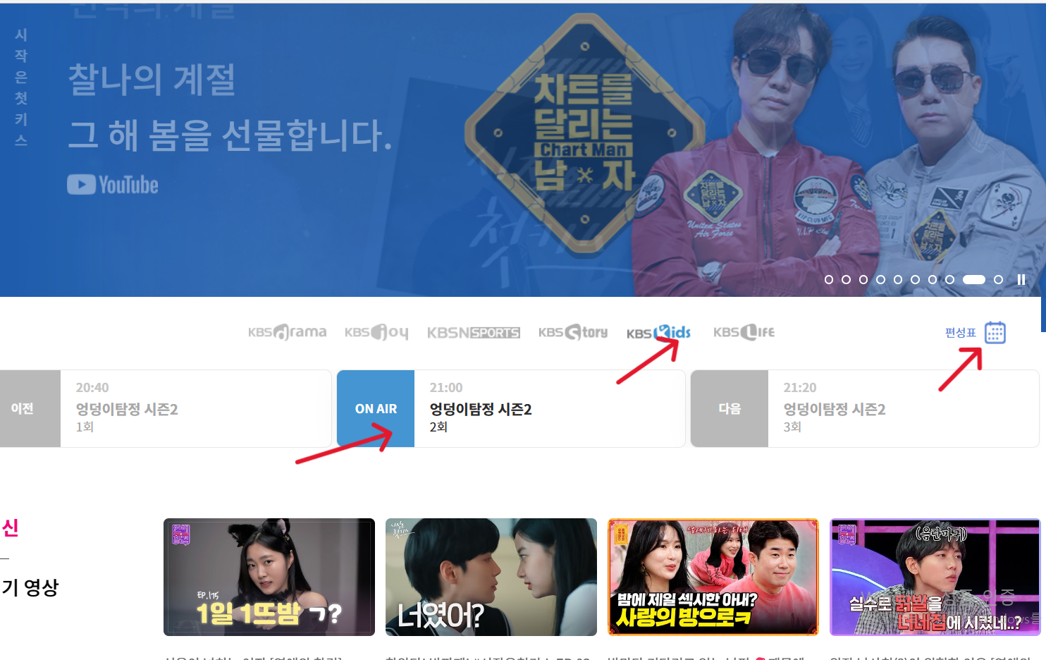 KBSKids 클릭한 후 편성표를 클릭합니다. 아래 사진을 참고하여 접속해 보시기 바랍니다.