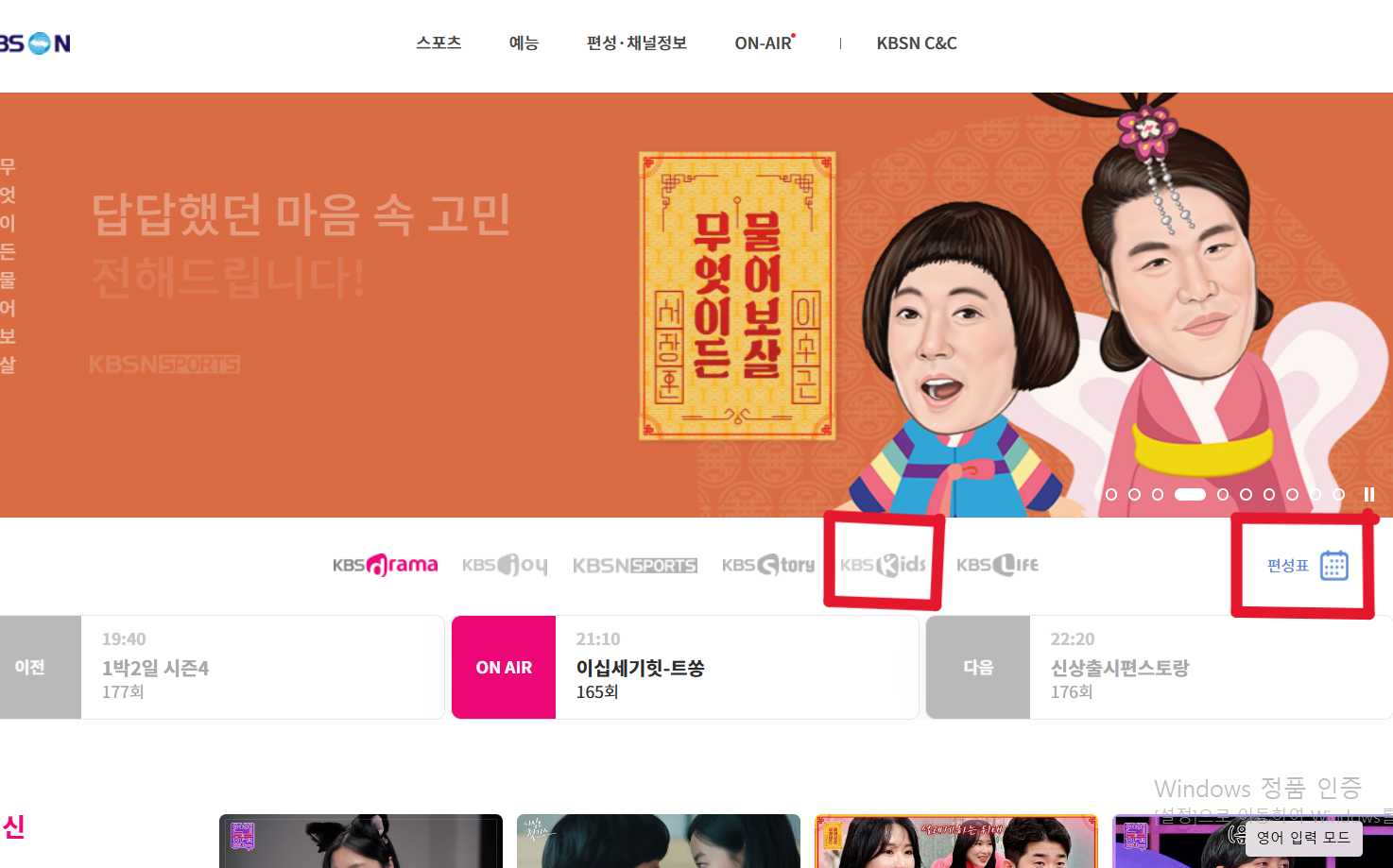 KBS N홈페이지 접속 한후, 가운데 메뉴에서 KBS Kids 를 클릭하면 접속한 시간에 방송중인 프로그램이 나옵니다.