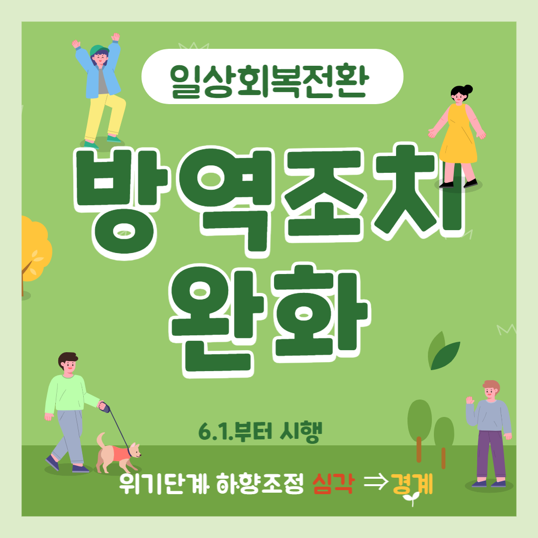 6월 1일부터 "펜데믹을 지나 일상으로"라는 슬로건으로 코로나 19 방역조치를 완화시행한다고 문화체육관광부 국민 소통실에서 발표했습니다. 중앙방역대책본부는 6월 1일을 시작으로 코로나 19 위기 경보를 '심각'에서 '경계'로 하향 조정합니다.